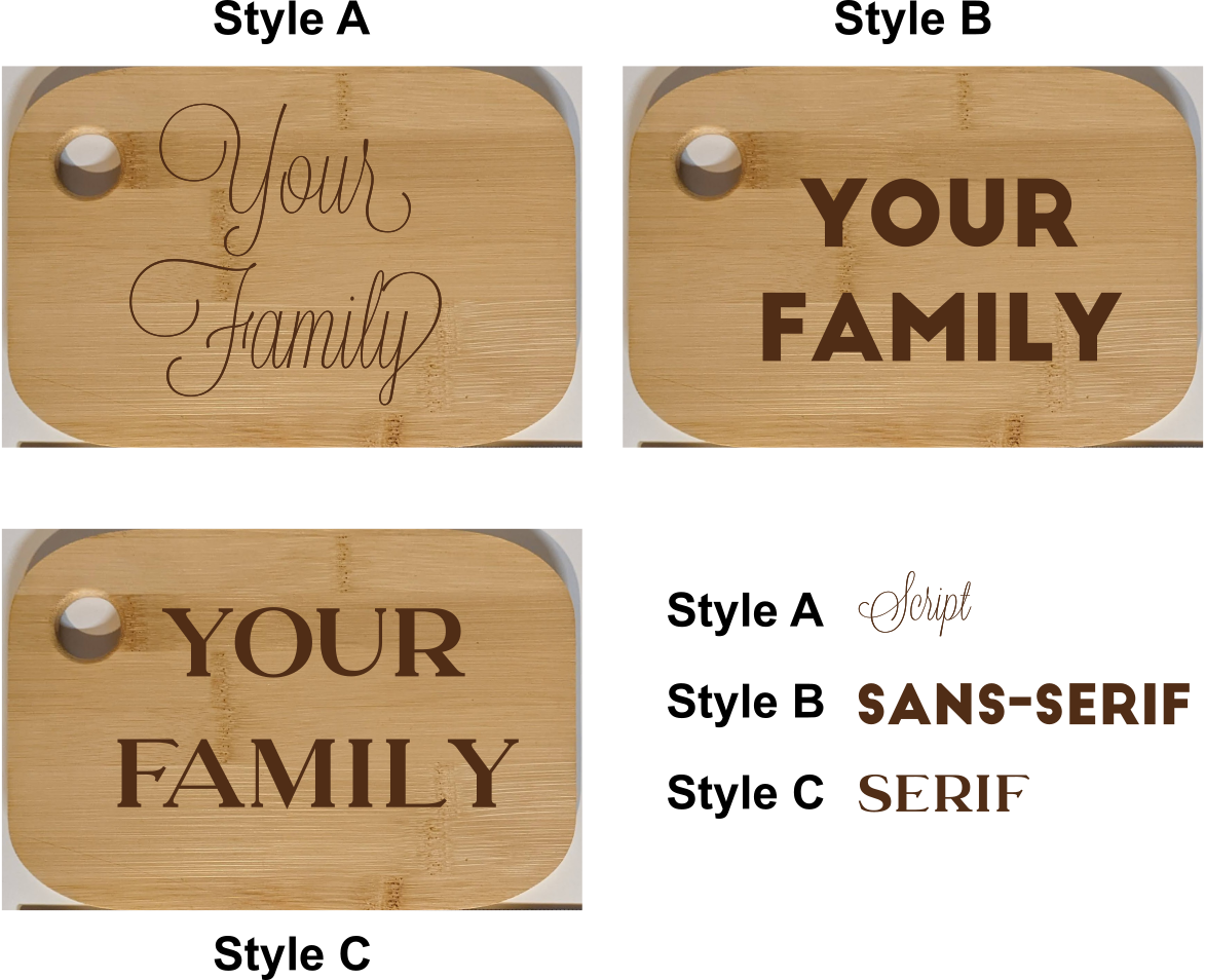 The text is laser engraved and then coated with a food-safe mineral oil to protect and seal the cutting board surface.