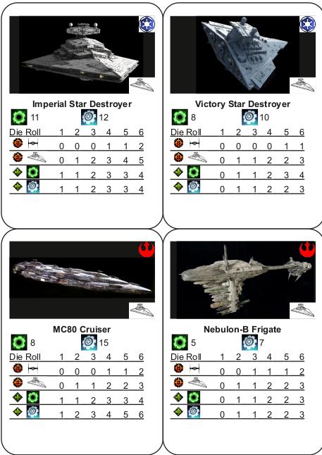 Behind the scenes, each type of ship has a range of values. You can see what the original cards looked like in this image. The top row is attacking fighters. The second row is attacking capital ships. The third row is repairing the hull. And the fourth row is repairing shields. So you can see that most of the capital ships aren’t very good at attacking fighters. They will miss most of the time. There are also some little details from Star Wars lore. For example, the Mon Calamari MC80 Cruiser is known for having a comparatively weak hull but excellent shields. So you can see that it has a much lower hull value than the Imperial Star Destroyer, but also much higher shields. Also, the MC80 can repair more of its shields per turn than the Imperial Star Destroyer can.