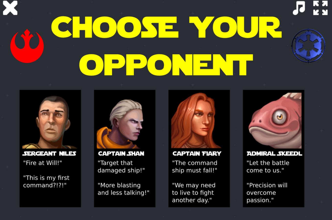 At the easy end, Sergeant Niles just queries a random available ship from his side and a random ship from the enemy side. And then he blasts it. That’s it. Totally random. He doesn’t know what he’s doing, so he’s pretty easy to beat.