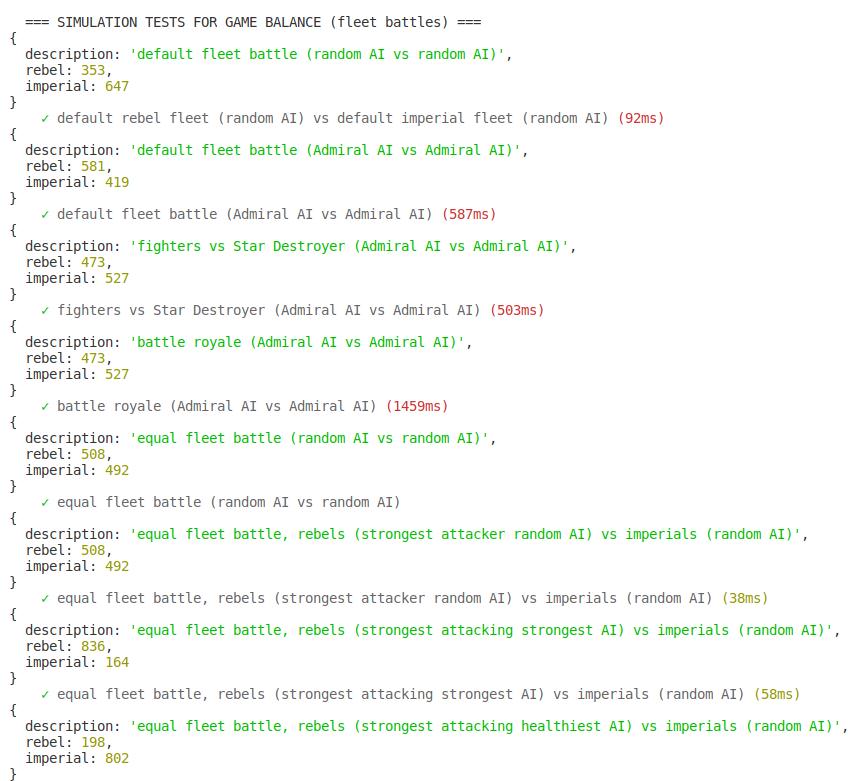 A lot can be learned by asking a five-year-old to play a game without any instructions! He understood it quickly, but whenever he asked a question or misunderstood something, the visuals and sound effects were updated to try to make it more clear what happened. The primary game balance was determined through thousands of simulations. Underneath the hood, the computer has the ability to simulate complete battles against itself. So the various artificial intelligences were pitted against each other in thousands of mock battles. Then the battles were tweaked to make them pretty balanced. The goal was to have each battle be about a 50% chance when two smart players were battling each other. To simulate this, most simulations featured the advanced AI (Admiral Skeedl) playing against himself. When Admiral Skeedl got close to 50/50 over a thousand mock battles, it was deemed decently-balanced.